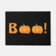 Door mat shown with a black background and a Halloween boo! print.