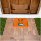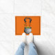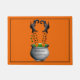 Halloween doormat is shown with a witch in a bubbling pot print on a orange background color.