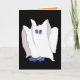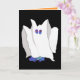 Dramatic Dragon dresses up as a ghost for Halloween - the traditional 'eye holes in a sheet' way, on this fun Halloween card, art and design by J.M.Tellam BA (Hons), copyright Mindgoop