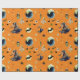 Watercolor Halloween elements including skulls, bones, bats, cauldrons and candies on orange background.