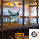 This Scary Custom Shaped Halloween Flying Vampire Bat window decal features a spooky vampire bat flying though moody clouds. The design is in shades of green blue and purple. This window cling is a perfect decor for your business ,office or home window creating a distinctive mood for the haunting Halloween season.