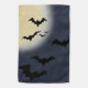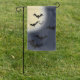 Home And Garden Yard Flag Sign with Halloween Full Moon With Bats artwork design image by TheFabricSeal at Zazzle.com is a illustration drawing with bat eyes looking out for friends and prey alike and a cool dark Halloween night of adventure, goblins, ghouls, and trick or treat sweets. The nightly flight flying black bats are out in force for their fright night Halloween flight. Amazing glowing concentric circular gradient auroral rings around the full moon with colors of creamy yellow and white toned harvest moon glow, deep dark blue and black night sky plus the jet black colors of the flying bats. This image design was incorporated into two cool looking abstract repeating pattern versions