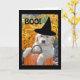 Photograph of golden retriever puppy wearing a witch hat, sitting in a straw pumpkin basket with orange mums in the background. This image is used to create funny, cute golden retriever puppy Halloween greeting card.