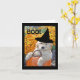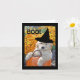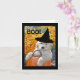 Photograph of golden retriever puppy wearing a witch hat, sitting in a straw pumpkin basket with orange mums in the background. This image is used to create funny, cute golden retriever puppy Halloween stationary note cards.