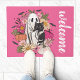 This doormat features a charming ghost cuddling a wide-eyed black cat, surrounded by whimsical fall florals, pumpkins, and fluttering bats — all set against a bold pink background. This cute and quirky design blends spooky season vibes with cottagecore charm and girly flair, perfect for anyone who loves Halloween with a side of flowers and fun.