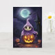 This is a whimsical Halloween-themed illustration. The central figure is a cute, ghost-like character with a skull-like face, wearing a purple hooded cloak. The character is emerging from a large, glowing jack-o'-lantern, adding a playful and eerie atmosphere to the scene. In the background, there is a full moon illuminating the night sky, along with flying bats and a spooky, crooked house with lighted windows. Additional jack-o'-lanterns and barren, twisted trees contribute to the haunted, magical feel of the image. The overall tone is playful yet spooky, capturing the essence of Halloween.