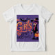 This vibrant Halloween-themed illustration features a playful character dressed as a witch. She sports purple hair, a black witch hat with a purple band, and a black coat, holding a glowing carved pumpkin in one hand and a candy corn in the other. Surrounding her are flying bats and decorative swirls, enhancing the spooky atmosphere. The word "Girls" is prominently displayed in large, orange, and stylized letters, with the playful phrase "go get pumpkins" below it in a whimsical font. This design perfectly captures the fun and festive spirit of Halloween, making it a delightful addition to any spooky celebration.