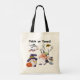 Here is a cute Halloween Trick or Treat bag that features gnomes. One has a smiling jack o' lantern and wears a purple witch hat. Another one carries a wooden "BOO!" sign and has a jack o' lantern hat. The third one rides a broom. There's also a spooky tree, a black bat, and a cat who also wears a witch hat. Black text at the top says Trick or Treat!, with your child's name at the bottom. The back of the bag has the same image and text, except for the name.
