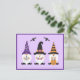 Cute cartoon illustration of Halloween themed gnomes holding a trick or treat candy bucket, spiderweb, and a broom.