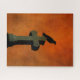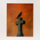 Crow on a cross with a deep Halloween orange ky on a hard to put together puzzle.