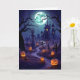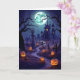 This is a Halloween-themed illustration depicting a spooky, eerie graveyard at night. The scene is lit by a bright, glowing full moon, casting an ethereal light over the setting. Bats are flying across the moon, adding to the Halloween atmosphere. The graveyard is filled with tombstones and crosses, with a winding path leading to a haunted-looking mausoleum or chapel in the background. The area is adorned with numerous jack-o'-lanterns with glowing, carved faces, providing a warm contrast to the cool, dark tones of the graveyard. The twisted, barren trees contribute to the creepy, haunted ambiance of the illustration. The overall effect is a classic, atmospheric Halloween scene that is both spooky and enchanting.