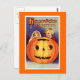 Vintage Halloween card showing two sweet children peeping over a big pumpkin with a smiling face.