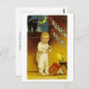 Vintage Halloween greeting card illustration showing a Victorian child frightened by a black cat at the window.