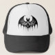 Halloween trucker hat is shown in a Black and White with a haunted bat print.