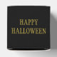 These Halloween party favor boxes feature ghosts at a haunted house, a full moon, and a flying bat on a black background.