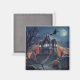 Spooky Halloween haunted house at night with a witch and her cat flying high above on a refrigerator magnet.