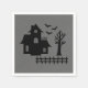 Destei's stylish and simple silhouette design of a haunted house together with three bats, a creepy tree and a crooked fence. The background color is gray.
