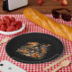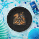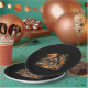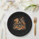 Paper plates with a cool and spooky illustration of a wooden haunted house. Surrounded by big orange pumpkins and trees with orange leaves. Windows with orange lights add a nice glow. Fun Halloween design.