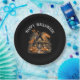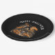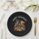 Paper plates with a cool and spooky illustration of a wooden haunted house. Surrounded by big orange pumpkins and trees with orange leaves. Windows with orange lights add a nice glow. Fun Halloween design.