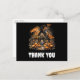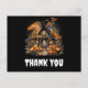 Thank you postcard with a cool and spooky illustration of a wooden haunted house. Surrounded by big orange pumpkins and trees with orange leaves. Windows with orange lights add a nice glow. Fun Halloween design.