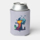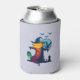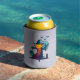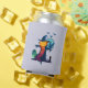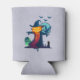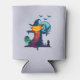 Can cooler with a cool halloween illustration. Set on a gray lavender grunge background. A large haunted scarecrow, looking evil with a jack-o-lantern pumpkin head, wearing a witches hat. He has a menacing grin wearing tattered robes and is standing in a graveyard with a crow screeching on his arm. Bats flying off in the distance, a full moon in the background and a lone owl with glowing eyes sits on a tombstone.