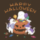 A cute illustration of a numbat wearing a wizard costume and flying on a broom with a pumpkin bucket for Halloween