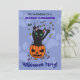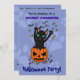 Halloween invite black cat jumping from pumpkin