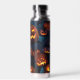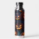 This beverage bottle features a fun Halloween pattern of grinning and glowing Jack o' Lanterns. The images are placed on a dark blue/black background.
