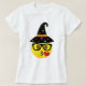An emoji wearing a witch hat with a kissy face and nerd glasses. Great Halloween shirt to wear as a costume alternative.