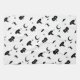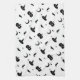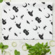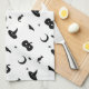 Halloween Kitchen Towel with a White Background and Spooky but Cute Halloween Silhouettes of Cats, Bats, Stars, Moons, Candy and Witch's Hats. Art by Sara Motolanez