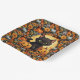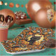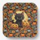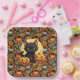 A Square Paper Plate Of A Black Kitten With Jack O Lantern Pumpkin Center Patterned In Sunflowers And Orange and Silver Pumpkins