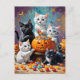 This vibrant design features a group of adorable kittens with a mix of white and black fur, playfully gathered around an orange pumpkin candy bowl overflowing with colorful treats. The setting is festive with autumn leaves and Halloween motifs, making it perfect for the spooky season.