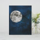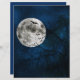 Dark blue textured background with full moon and silhouettes of a creepy stooping tree and flying bats.