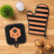 The Halloween Mosaic Jack-o-Lantern with Optional Text Pot Holder and Oven Mitt Set is a festive addition to your kitchen for the spooky season. The pot holder features a black background with a mosaic jack-o-lantern showing a surprised face made from trapezoid tile shapes. The oven mitt boasts a black and orange striped pattern and allows you to add two custom lines of text at the bottom. Both items are available with either a silver quilted or black silicone backing, offering both style and practicality. You can purchase the set together or choose to get just the pot holder or oven mitt separately. **Order now** to add a touch of Halloween fun to your cooking essentials.
