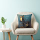 A blue and purple Halloween "Naughty or Nice" throw pillow with a black cat and owl sitting on a tree branch at night.
