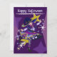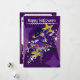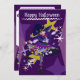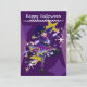 Cute Halloween Neko Witch on a purple holiday card on the front. On the back is the invitation text that can be personalized by customers.