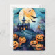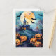 Halloween postcard featuring a watercolor illustration of a haunted mansion, the Moon, bats and jack o’lanterns.