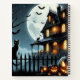 A scary house with full moon, cat, pumpkins and bats