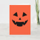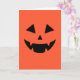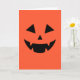this spooky orange happy Halloween card features a creepy pumpkin face. the inside says happy Halloween with spooky bats flying.