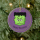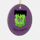 This ceramic porcelain ornament is shown in the round shape with a Halloween Frankenstein art print.