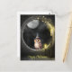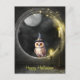 An owl wearing a fancy witch hat sits in the round window of a tower with a night sky and full moon behind it. Lit candles are nearby and magical stars swirl up near it.