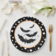 Halloween party paper plate is shown in a black and white polka dots design with a bats print.