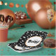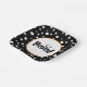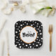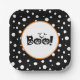Halloween party paper plate is shown in a black and white polka dots design with a Boo! print.