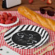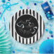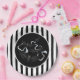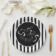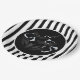 This Halloween paper plate is shown with a festive black and white stripes and bats design.