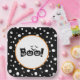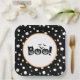 Halloween party paper plate is shown in a black and white polka dots design with a Boo! print.