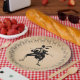 Halloween paper plates with a gothic and vintage aesthetic. Featuring a spooky dancing skeleton graphic on an aged paper effect background with an ornate circle.