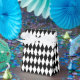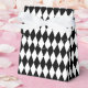 This party favor box is shown in a black and white Harlequin diamond pattern print.