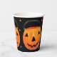 Creative Halloween party or dinner cups featuring colorful trick-or-treat vintage pumpkins on black background.