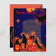Halloween Party postcard with orange glowing pumpkins, blackbirds, ravens, black cat and full moon in cemetery setting with tombstone. Black birds flying around in dark Halloween nite sky. Orange fog around tombstone and characters. Fill in your party information on tombstone. Dark blue night sky and black background. Lots of blacks and oranges. Artwork by Patricia Villa.