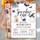 Celebrate with these fun and trendy "Spooky ONE" Halloween 1st birthday invitations. This modern 1st birthday invitation is featuring hand painted watercolor ghosts, black cats, pumpkins, bats and spider webs. Halloween pattern in the back. You can personalize the wording, font style, color and size in front and back of the invitation. Please fell free to contact me for matching items.